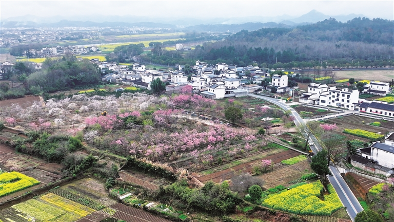 眼下,屯溪区屯光镇汉沙村60余亩樱花迎来盛花期,连片花海在村落间舒展,粉白枝头如云似霞,勾勒出一幅诗意悠然的徽州春日图景。