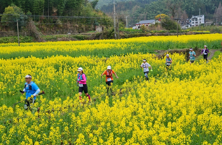 3月21日,参加2026户外特工黄山西宏越野春季赛的各国选手穿行在油菜花海中,感受春景中运动的快乐。许家栋/摄