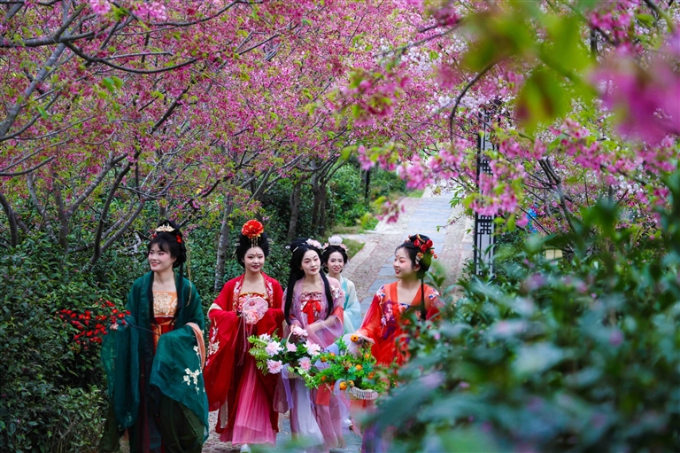 3月21日,祁门县平里镇樱花园内樱花进入盛花期,粉白相间、如云似霞,吸引了一批身着各式汉服的游客前来踏青赏花、打卡拍照。