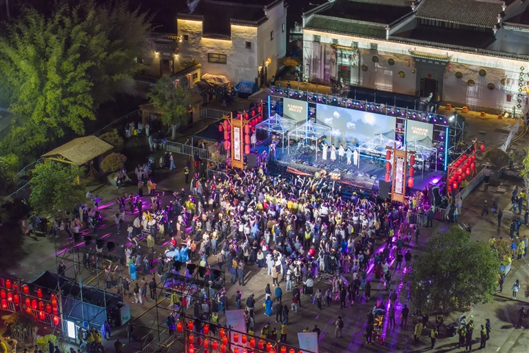 灵动的花灯,为旅游节增添了几分浪漫。《池娇映春》花灯巡游环节,演员们手持满池娇花灯与鱼灯,踏着轻快的步伐穿梭在舞台上,灯光流转间,将“池中美景、春意浮动”的画卷搬进了古村。演员们在舞台上轻盈起舞,花灯摇曳,光影交织,与现场观众近距离互动。欢声笑语中,古老的徽州民俗与春日的生机活力完美交融,让每一位观众都能触摸到徽州文化的温度。