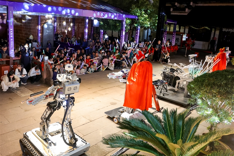 4月1日,休宁县状元博物馆举办机器人乐队科技音乐秀。智能机器人现场演奏,吸引众多市民前来打卡,感受科技与文旅融合的新体验。