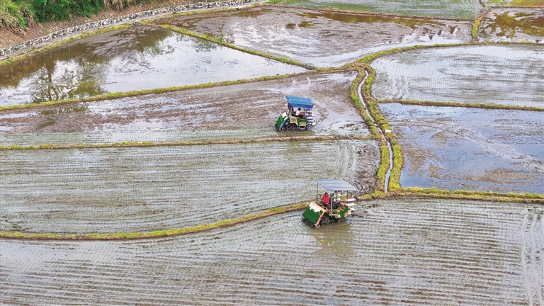 当前,祁门县3500亩再生稻全面进入栽插期。在安凌镇,田间地头机声阵阵,农机手驾驶着高速插秧机来回穿梭作业,一株株再生稻秧苗整齐划一地被植入田间,空旷的水田披上一层绿装。