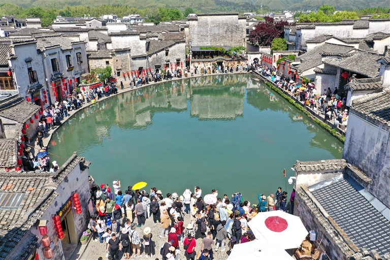 5月1日,黟县宏村景区游人如织。 许家栋/摄