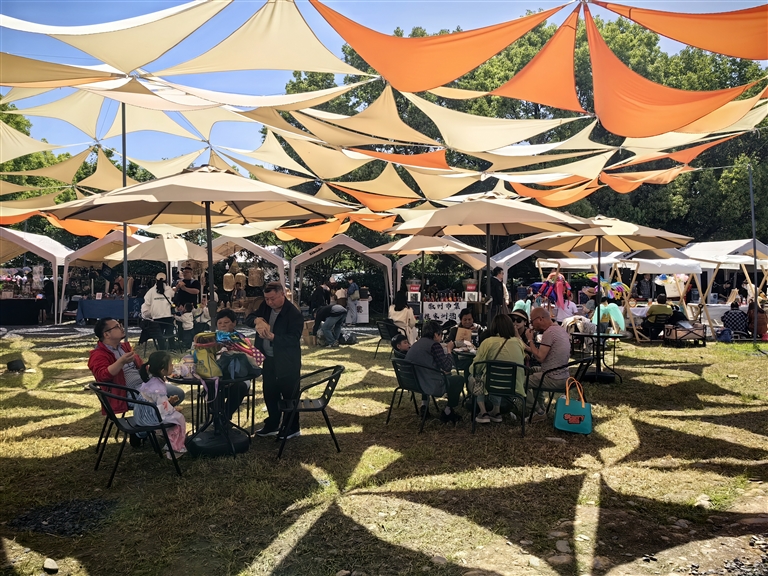 山脚下的坐忘花园集结了20余个摊位,有各式各样的美食、手工制作纪念品、新潮的小玩意儿,烟火气息浓郁。