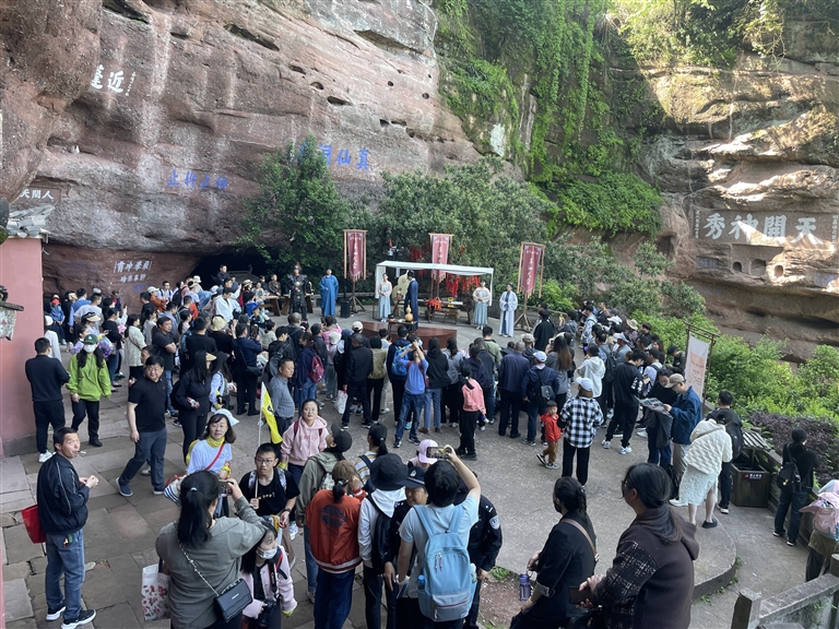 5月1日上午,休宁县齐云山风景区热闹非凡,游人如织。