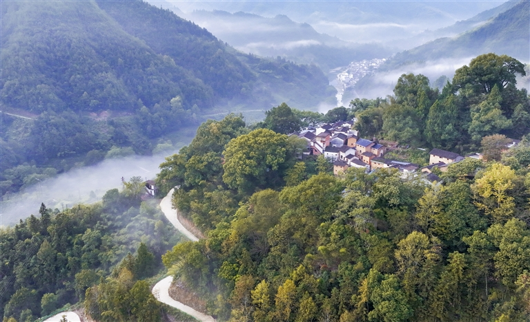 10月22日,深秋的歙县武阳乡高山古村落尚武村古树环抱,错落有致的民居和蜿蜒的盘山公路交相辉映,共同勾勒出一幅令人陶醉的乡村生态美景图。