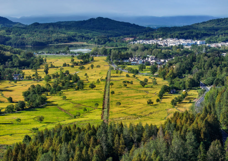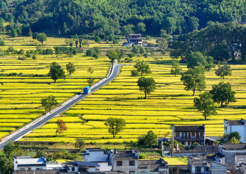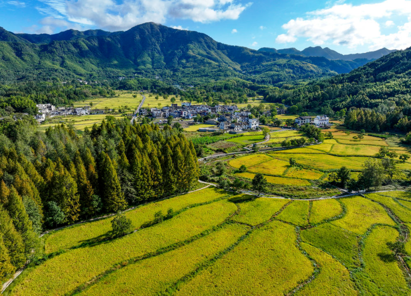 金秋时节,黟县宏村镇塔川国家森林公园内,金黄稻田与粉墙黛瓦的村落相映,绘就一幅丰收与古韵交织的秋日画卷。