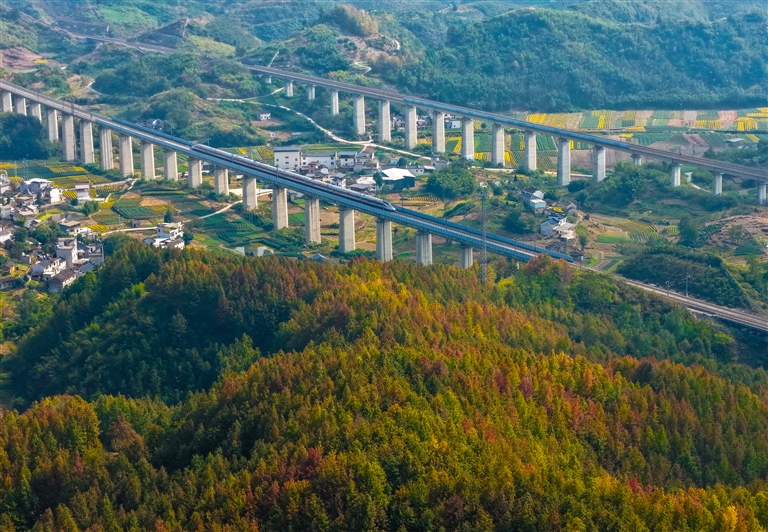 日前,列车从歙县溪头镇桃源村的斑斓秋色中驶过。