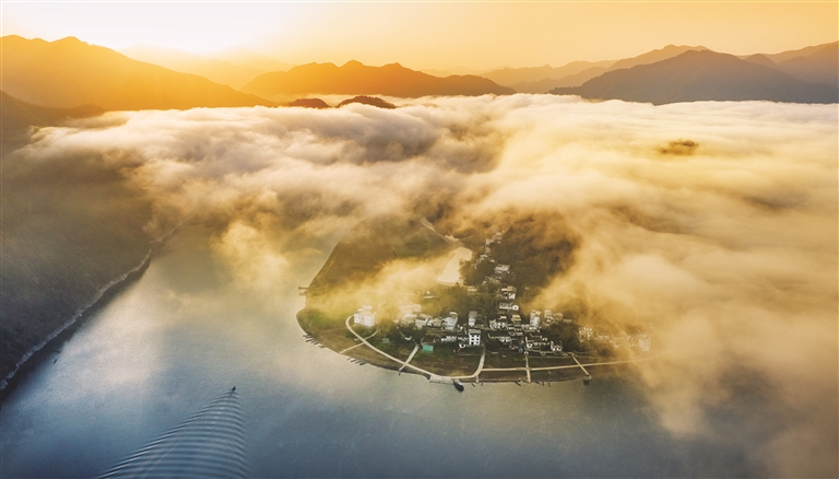 11月26日,歙县深渡镇新安江山水画廊凤池岛,云雾如纱幔缠绕山峦与村落,江面波光与金色朝阳交辉,宛如仙境。