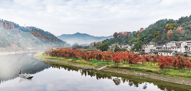 红杉映碧波