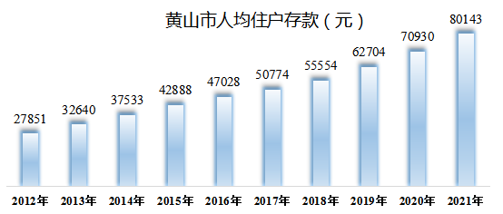 数据显示,2021年,黄山市常住人口人均存款增加至8万多元,比10年前净增5万多元,居全省第2位。