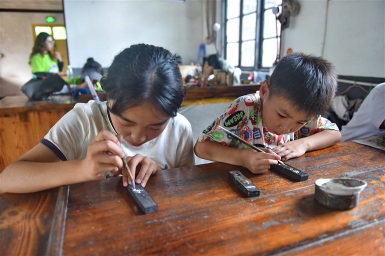 8月15日,研学游的学生们在歙县老胡开文墨厂体验徽墨描金。