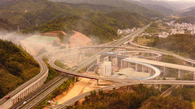 10月13日拍摄的德(州)上(饶)高速祁门至皖赣界段工程祁门金字牌互通施工现场。