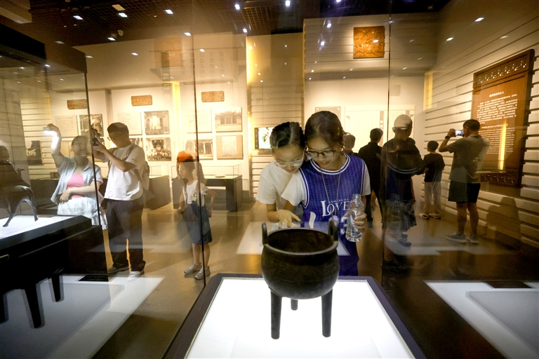 7月17日,家长带着孩子在安徽中国徽州文化博物馆内参观,近距离感受历史和徽文化的魅力。
