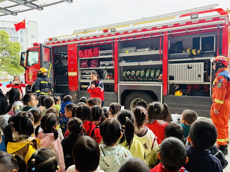 11月6日,徽州区凤山幼儿园联合区消防救援局开展了一场生动有趣的“消防车进校园”主题活动,为孩子们带来了一堂沉浸式消防安全体验课。(余朝晖 陈蓓/摄)