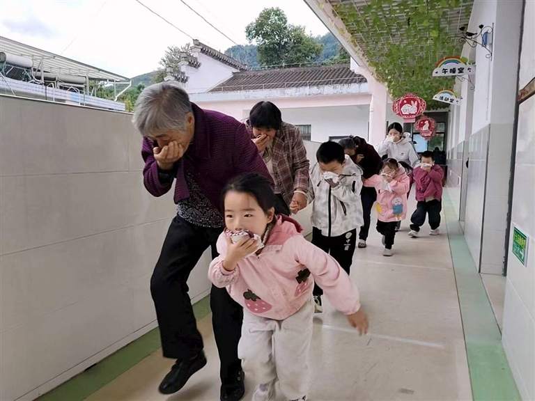 11月7日,歙县深渡镇中心幼儿园开展了一场别开生面的“家园警牵手,消防‘童’步走”消防演练活动,在孩子们心中播下了消防安全的种子。(吴红 吴巍/摄)