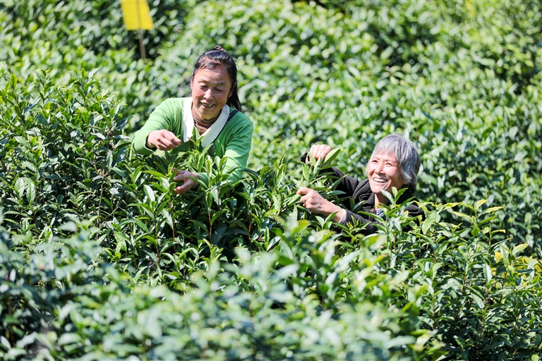3月28日,在徽州区富溪乡黄山毛峰核心产区,茶农正抢抓晴好天气,采摘茶叶。樊成柱/摄