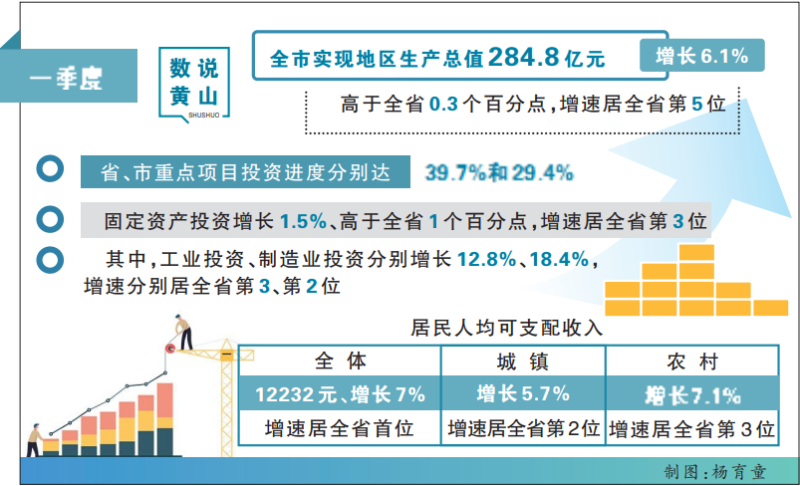 项目兴则经济兴,项目强则后劲足。黄山旅游T1线一期工程、黄山高新区汽车零部件创新生产基地等重大项目提速建设,一季度,省、市重点项目投资进度分别达39.7%和29.4%,固定资产投资增长1.5%、高于全省1个百分点,增速居全省第3位。其中,工业投资、制造业投资分别增长12.8%、18.4%,增速分别居全省第3、第2位。