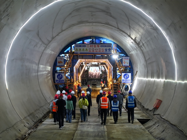 呈坎一号隧道位于徽州区呈坎镇,全长349米,是全线运架梁关键线路上的控制性工程。自2025年10月15日开工以来,建设团队直面工程安全风险高、工期紧张、作业空间狭小、工序交叉密集等多重考验,历经190余天艰苦奋战,安全高效实现隧道贯通。